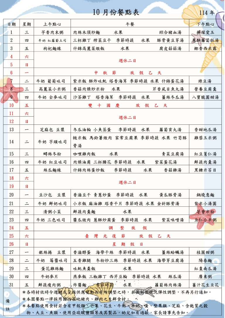 餐點表